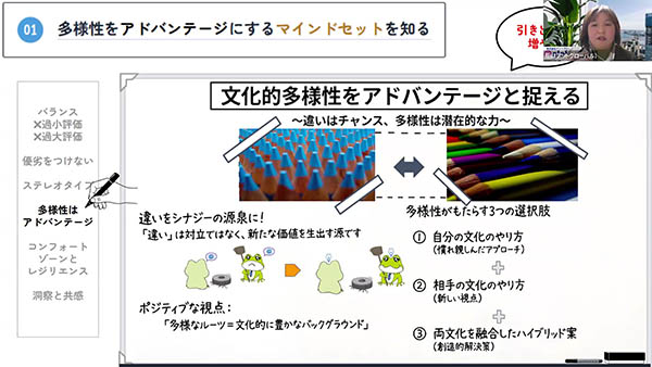 自国の文化を絶対視せず、文化的な多様性を組織のアドバンテージとして捉えるためのマインドセットについて学びます 。固定観念(ステレオタイプ)との賢い付き合い方や、違いと共通点をバランスよく分析する思考法を身につけます 。
