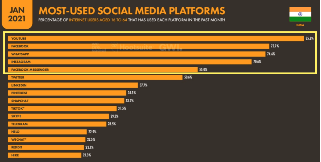 インドでのSNSトップ5は、1位YouTube、2位Facebook、3位Whatsapp、4位Instagram、5位FBMessengerです。